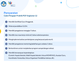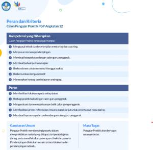 PGP Angkatan 12. Pengajar Praktik akan mendampingi Calon Guru Penggerak (CGP) dalam mempraktikkan materi yang didapat dari pembelajaran daring, serta merefleksikan penerapan di sekolah peserta. Pendampingan dilakukan melalui proses lokakarya dan pendampingan individu.